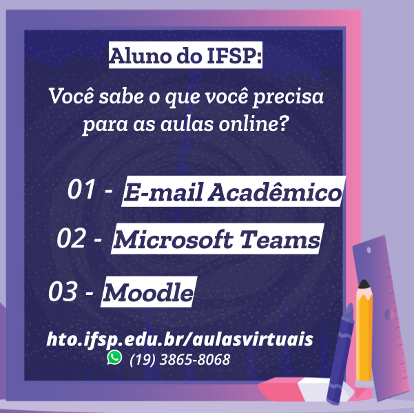 O retorno do calendário ainda em estado de pandemia prevê a realização de atividades online as quais irão utilizar algumas ferramentas de apoio. Acesse http://hto.ifsp.edu.br/aulasvirtuais e veja os tutoriais de apoio e os formulários para solicitar suporte em caso de problemas de acesso.
