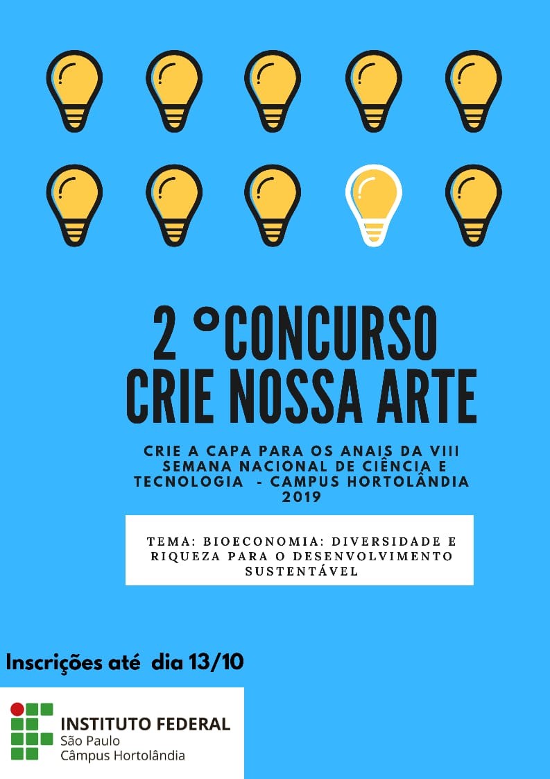 Se você é aluno do IFSP – Câmpus Hortolândia e se interessa por artes visuais, participe do II Concurso “Crie nossa Arte” do Câmpus Hortolândia e crie a capa dos anais[1] da VIII Semana Nacional de Ciência e Tecnologia de 2019 com o tema “Bioeconomia: Diversidade e Riqueza para o Desenvolvimento Sustentável”.