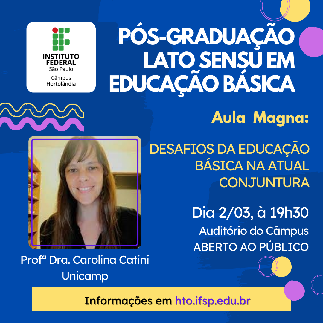 A Aula Magna será dia 02/03 (quinta-feira), às 19h30, no auditório do Câmpus, gratuita e aberta ao público. E será ministrada pela professora doutora Carolina Catini, da Faculdade de Educação da Unicamp, sobre o tema: "Desafios da Educação Básica na atual conjuntura."