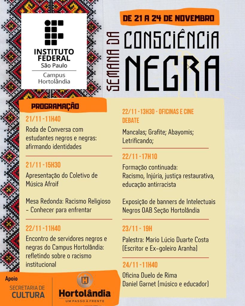 De 21 a 23 de novembro, o Campus Hortolândia do IFSP realiza a Semana da Consciência Negra 2023.