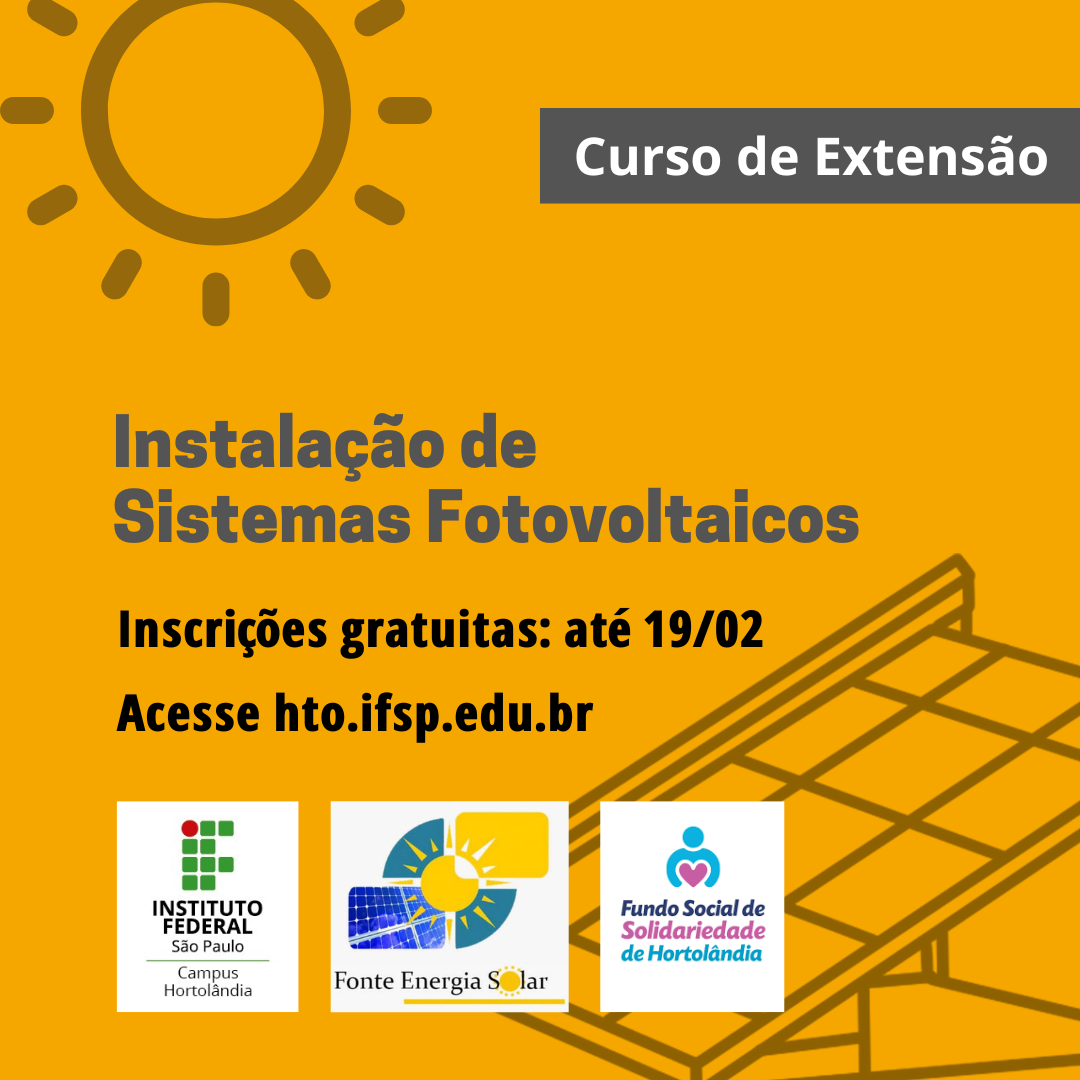 A proposta do curso de Instalação de Sistemas Fotovoltaicos é oferecer conhecimento básico e geral de um sistema solar fotovoltaico e capacitar para instalação de sistema fotovoltaico On-Grid. A primeira parte do curso que será EaD, serão apresentados conceitos fundamentais sobre a energia fotovoltaica, células fotovoltaicas, sistemas fotovoltaicos, dentre outros. A parte do curso presencial será realizada no IFSP Campus Hortolândia onde o/a estudante realizará a instalação de um sistema fotovoltaica num telhado didático. São 14 vagas para a ampla concorrência, 5 para pessoas autodeclaradas negras e 1 vaga reservada para pessoa com deficiência.