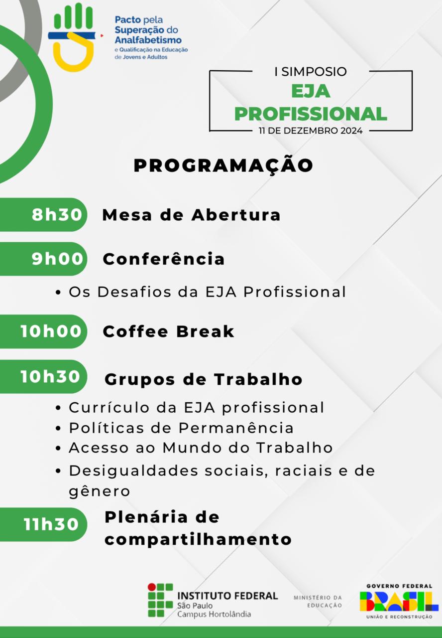 A atual gestão do Ministério da Educação (MEC) trabalha com uma série de iniciativas voltadas para a Educação continuada, alfabetização de jovens e adultos, diversidade e inclusão. Entre as principais entregas do ano estão: ampliação das matrículas na educação de jovens e adultos (EJA) integrada à educação profissional e tecnológica (EPT). Em parceria com o MEC e com as prefeituras locais, o Campus Hortolândia do IFSP pretende consolidar essa modalidade na Região Metropolitana de Campinas, seguindo um modelo nacional.