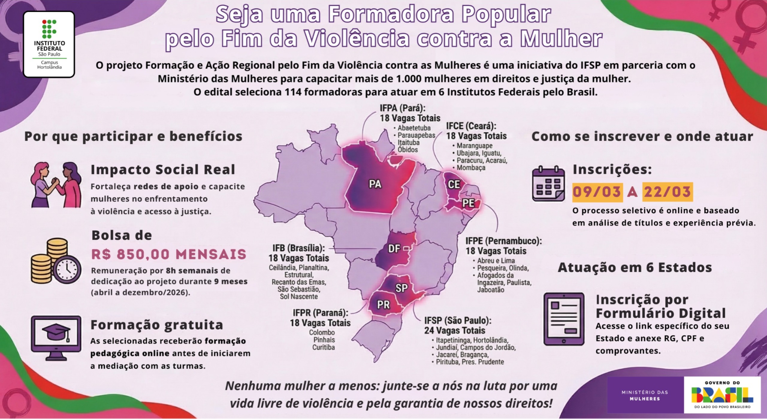 A ação nacional integra um Termo de Execução Descentralizada (TED) firmado entre o Ministério das Mulheres e o IFSP, com investimento de R$ 6 milhões para a realização das atividades formativas e das ações de mobilização social previstas no projeto.