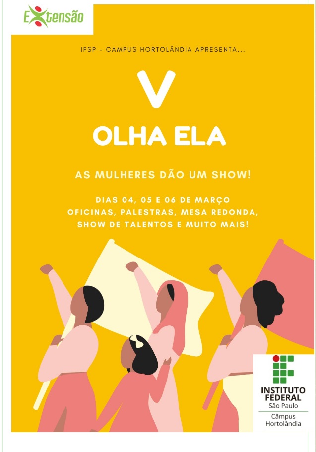 Em comemoração ao Dia Internacional da Mulher, celebrado no dia 08/03, o IFSP – Câmpus Hortolândia – realizará nos dias 04, 05 e 06/03/2020 o V Olha Ela. Neste ano, debateremos a questão de gênero tendo em vista as mais diversas dinâmicas sociais por meio de oficinas, show de talentos e rodas de conversa. O evento visa englobar toda a comunidade interna e externa do IFSP, objetivando a promoção das mais diversas perspectivas de debate da temática de gênero e o acesso a manifestações culturais que estejam atreladas ao tema proposto.
