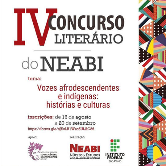 O Núcleo de Estudos Afro-brasileiros e Indígenas do IFSP (Neabi) realizará a 4ª edição do seu concurso literário. A ação tem o objetivo de promover e estimular a leitura, a produção e a difusão de textos literários produzidos por alunos e servidores do IFSP autodeclarados negros, indígenas e brancos, de modo a ampliar, de forma afirmativa, a construção de relações democráticas e igualitárias. Busca, assim, dar voz a indivíduos que discutam as lutas e conquistas étnico-raciais.
