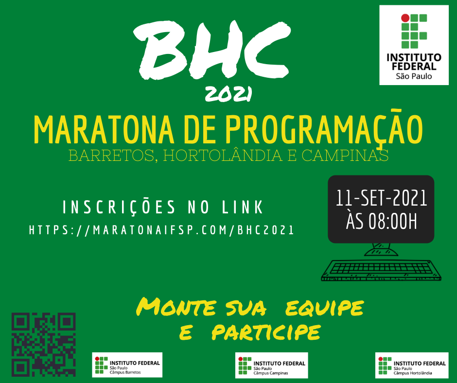 No próximo dia 11 de Setembro será realizada a 2ª edição da maratona de programação BHC. A BHC é uma competição de programação de computadores destinada aos alunos e alunas dos cursos da área de informática (técnicos e superiores) do Instituto Federal de Educação, Ciência e Tecnologia de São Paulo. É uma iniciativa dos câmpus Barretos, Campinas e Hortolândia.